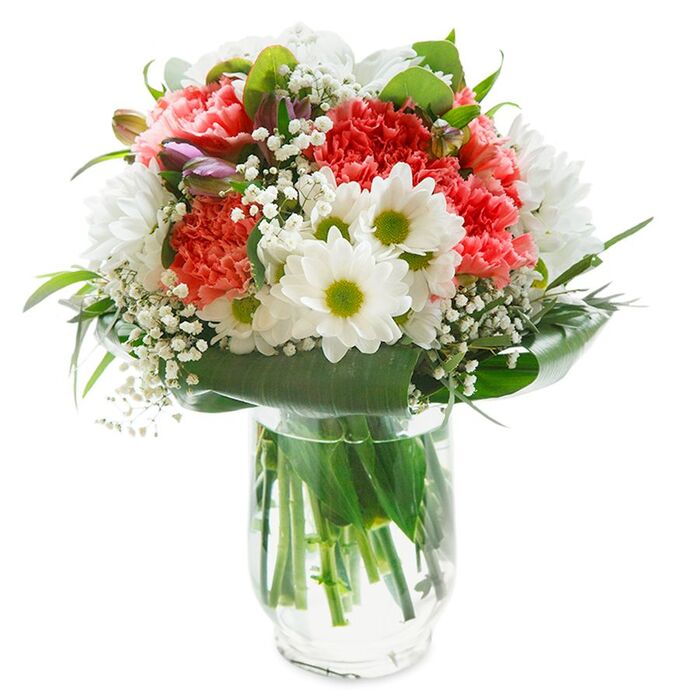 Add a touch of grace and beauty to any occasion with our exquisite flower bouquet. This arrangement showcases snow-white chrysanthemums, delicate gypsophila, and charming light pink carnations, artfully wrapped in vibrant aspidistra leaves to create a breathtaking display.